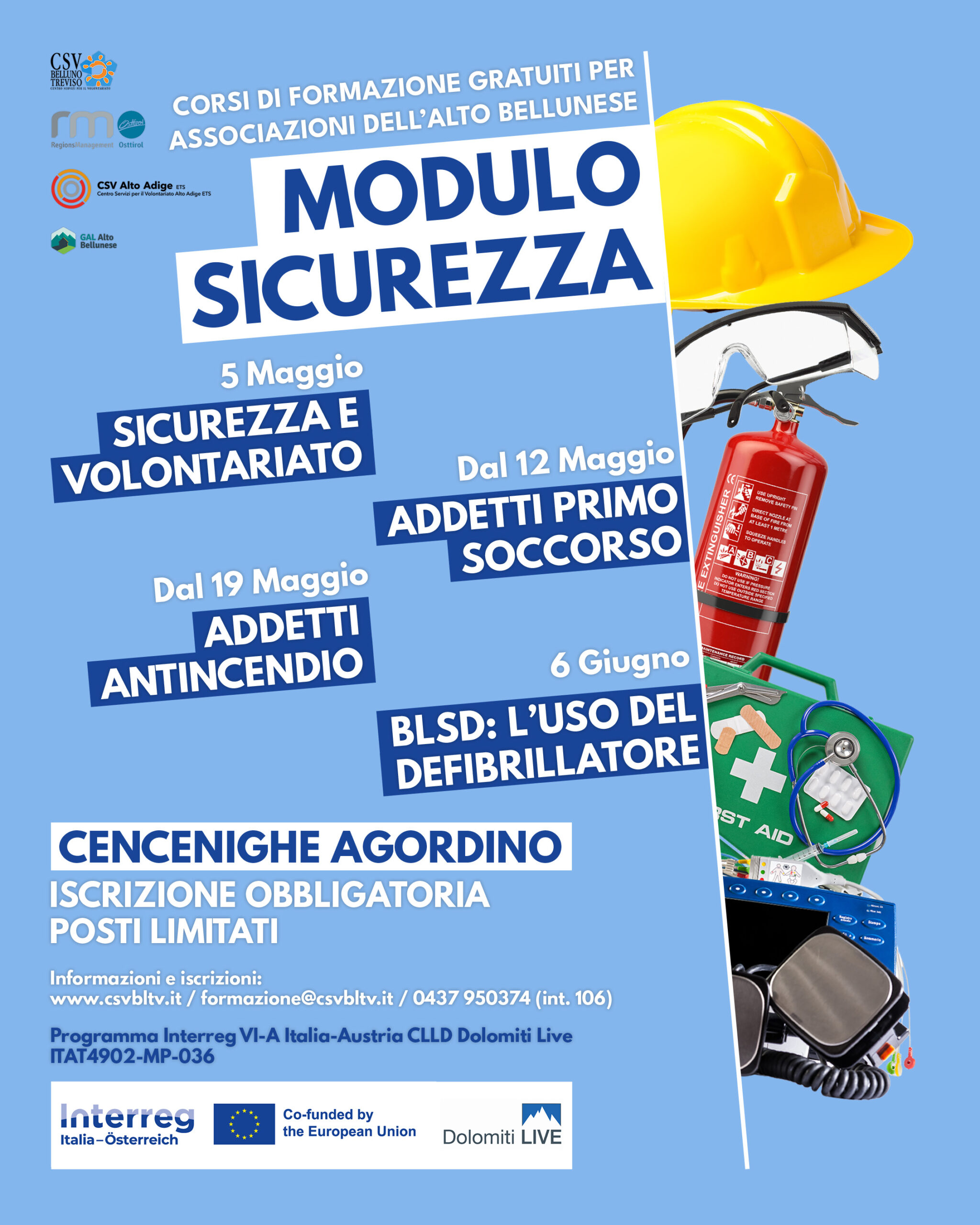 Nell’ambito del progetto "Impegno oltre i confini – Il volontariato unisce" (programma Interreg VI-A Italia-Austria CLLD Dolomiti Live ITAT4902-MP-036), Csv Belluno Treviso presenta un programma formativo per l'Alto Bellunese, con numerosi corsi di sicurezza in programma nelle prossime settimane a Cencenighe Agordino:
